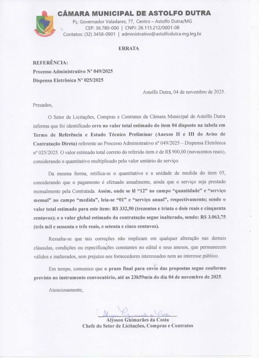 OBJETO: Contratação de empresa especializada em Medicina do Trabalho para prestação de serviços na área de medicina, segurança do trabalho e saúde ocupacional, para elaboração e implantação de programas, laudos, relatórios, sinalizações indicativas e envios mensais de eventos obrigatórios do eSocial que constituem os serviços especializados em Segurança e Medicina do Trabalho em atendimento à Câmara Municipal de Astolfo Dutra, por 12 (doze) meses, conforme especificações, quantidades, condições e exigências estabelecidas neste Termo de Referência.